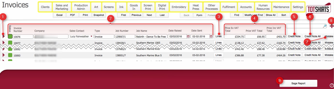 The Invoices List Layout displays invoice records which have been raised (in respect of job orders and/or fulfilments) in strokeone, together with their current status.