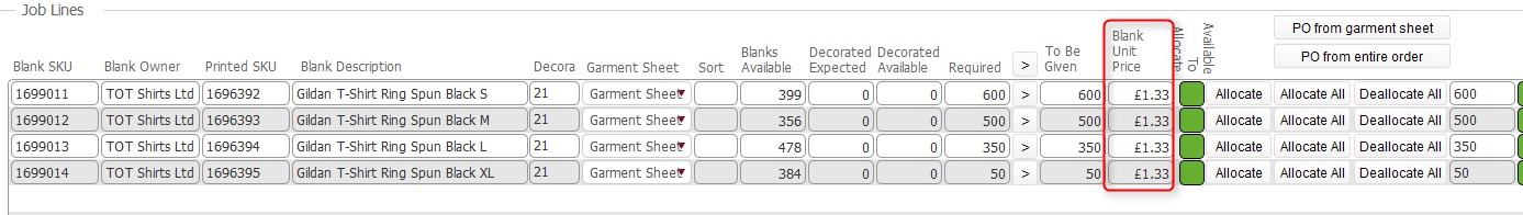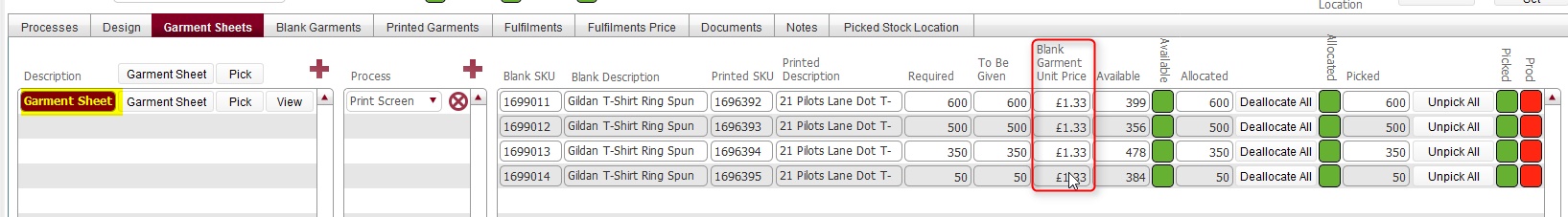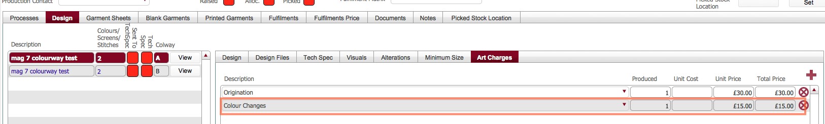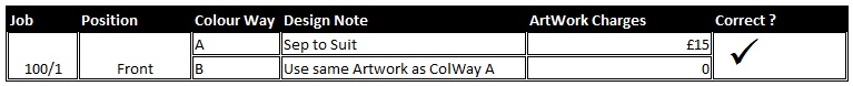 - Product Charges: i.e. the cost of blank garments if TOT supplying; if the customer is supplying there is a handling charge per garment