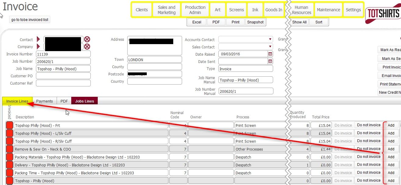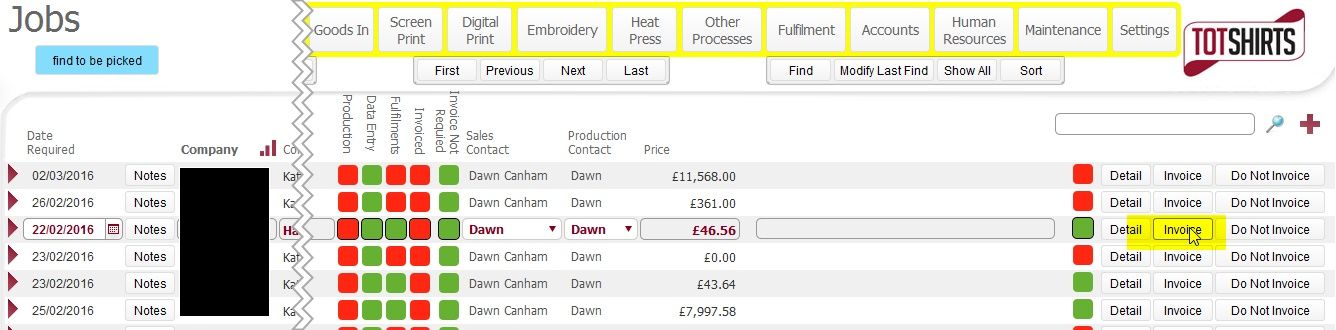 To raise an invoice for a job click the corresponding Invoice button against the record in this layout