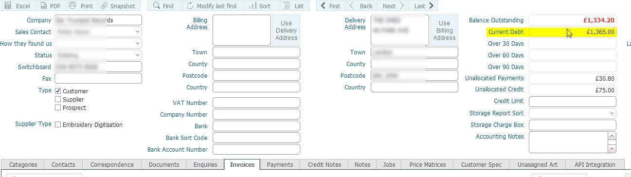 Current Debt is the sum of amounts outstanding on all the client's invoices.