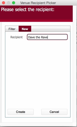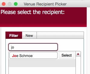 The Venue Recipient Picker dialog functions in a very similar fashion to the Venue picker dialog.