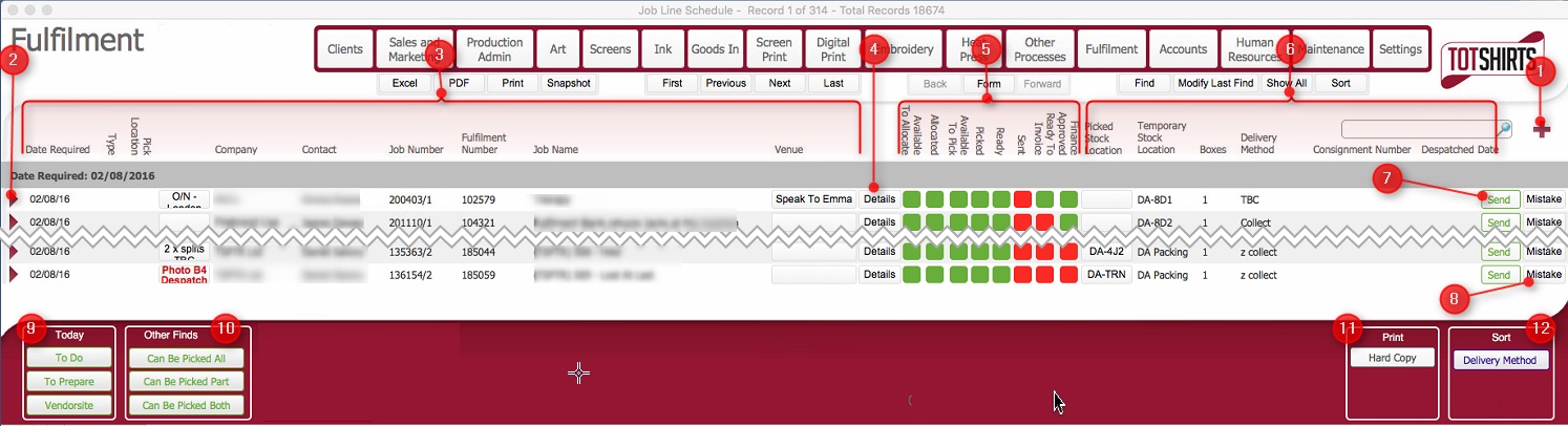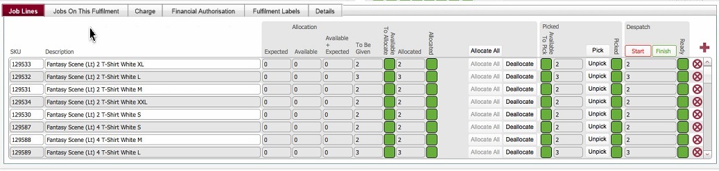 Job Lines tab which allows you to view the sku's required on the fulfilment, administer the processing of the fulfilment, i.e. allocating items, picking items, recording the start and finish of the assembly of the fulfilment.