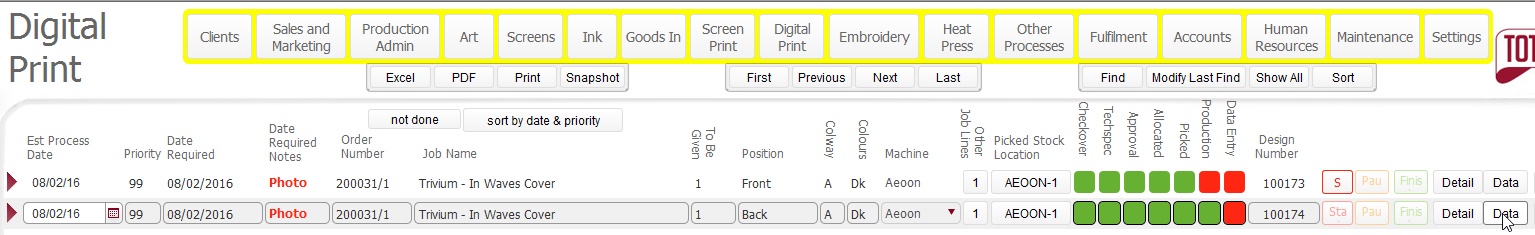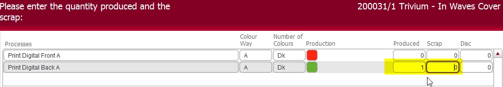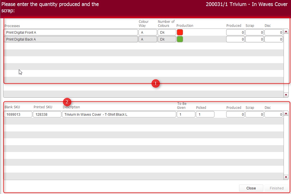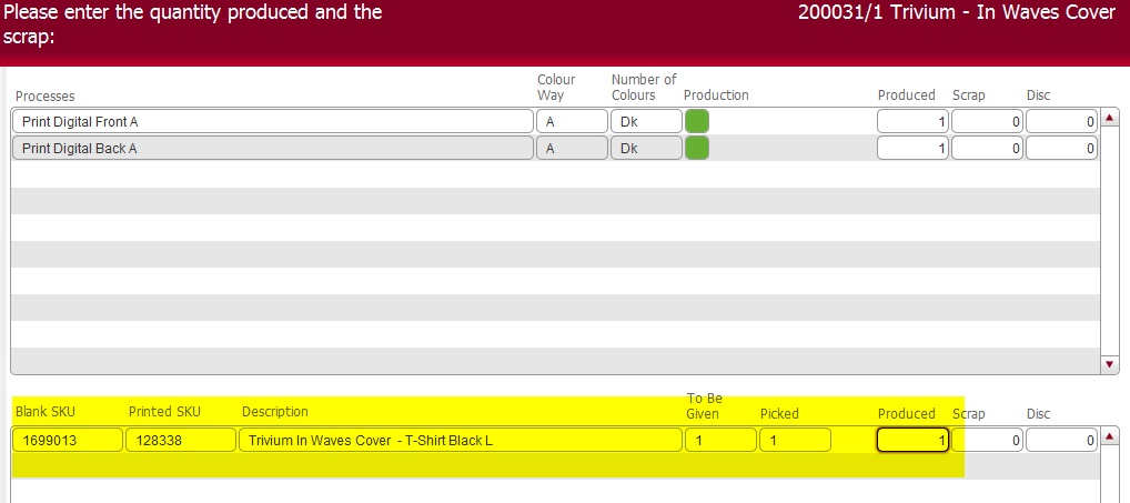 When the last process line on a job order is completed, the finalised quantities of the product produced (e.g printed garments) gets recorded