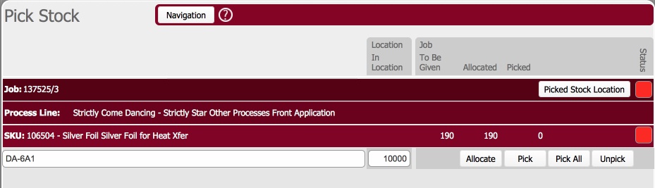 - Click the Picked Stock Location button at the top of the form