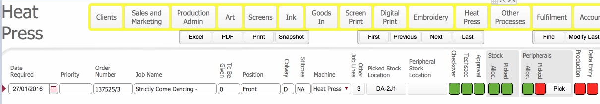 For example, a job order may require that garments are printed, re-labelled with swing labels and individually machine bagged.