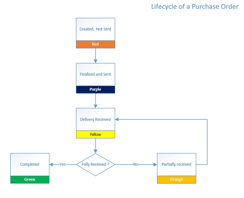 A Purchase Order has a life cycle, from creation, to sending, to the receipt of goods (fully or partially) and completion.