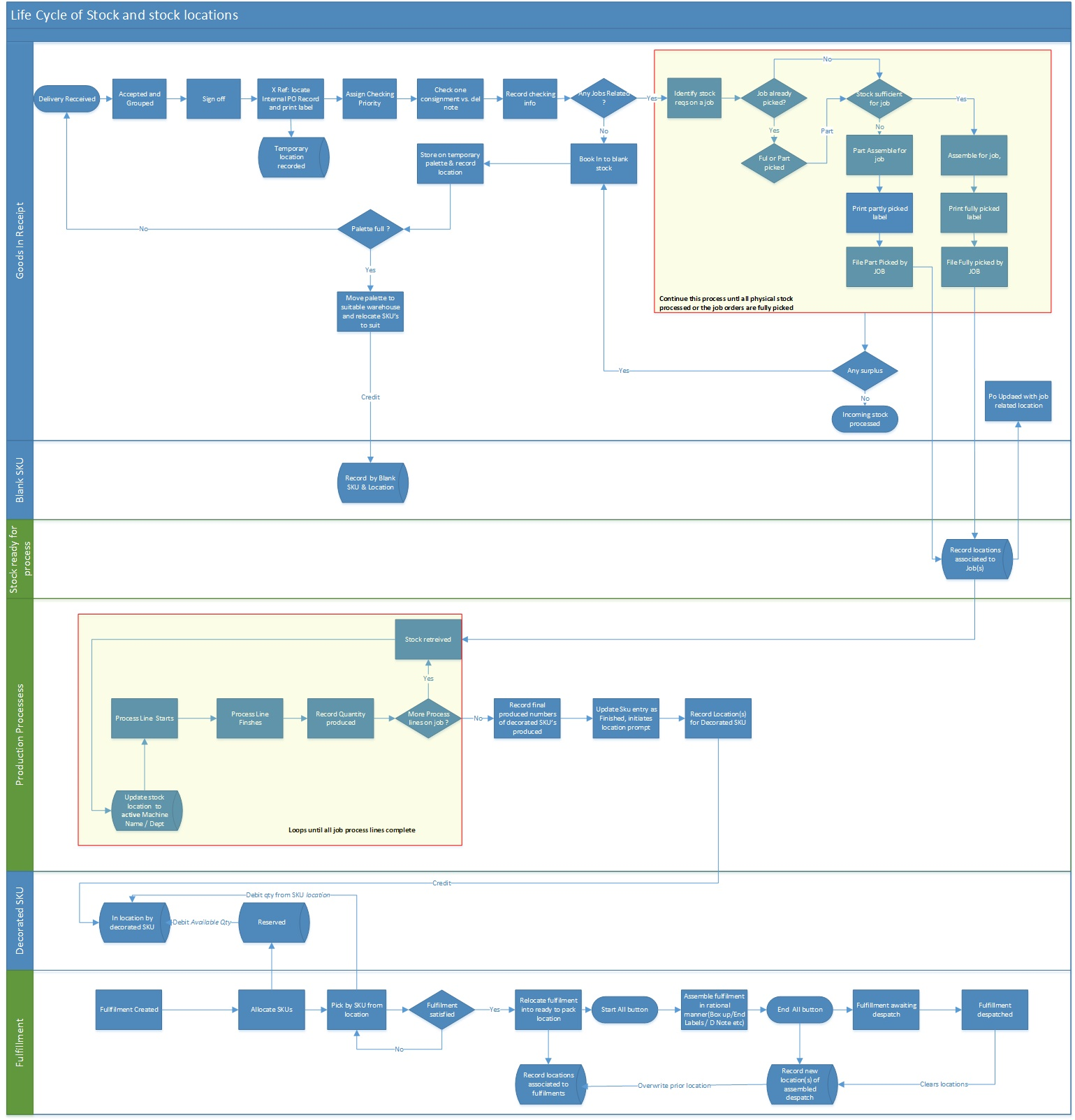 The following schematic illustrates the typical life-cycle of a stock line item used in the production of a decorated garment, as well as the stock location accounting that occurs.
