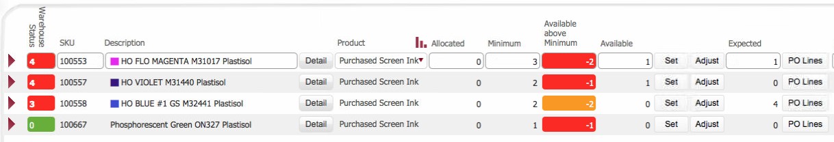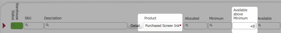 In this case, any Purchased Screen Ink stock line items where the Available above minimum field is negative.