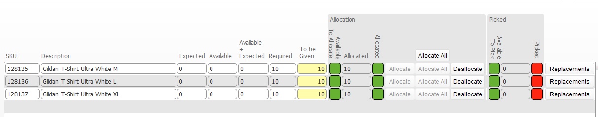 | Available to Pick | Items are fully available to pick, when the in warehouse balance