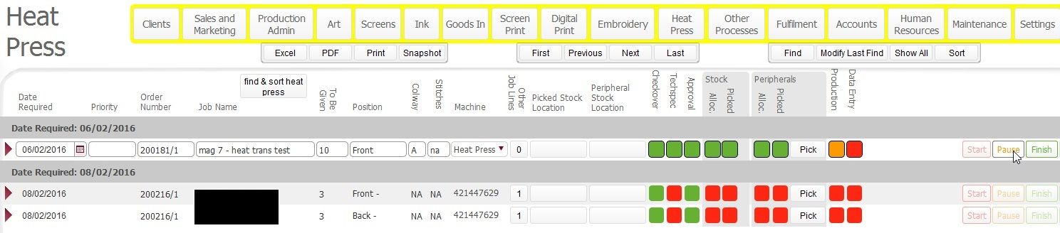 - When the heat-pressing begins again, click the Pause button again to toggle it back to In Progress (Amber)