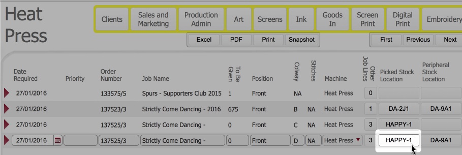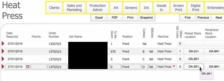 - Update the location of blank garments to denote that they have been collected from the ready for process area and are now placed with the specific heat-press machine, by following these steps. Click here to show steps.
