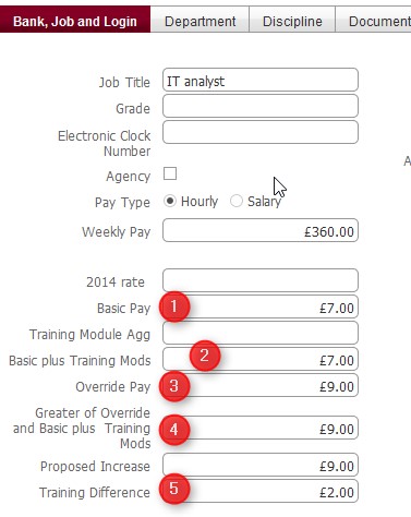 In determining, what John should be paid, strokeone calculates the greater of Override Pay (3), versus Basic Plus Training Mods (2), and sets the field Greater of Override and Basic plus Training Mods (4) with the result.
