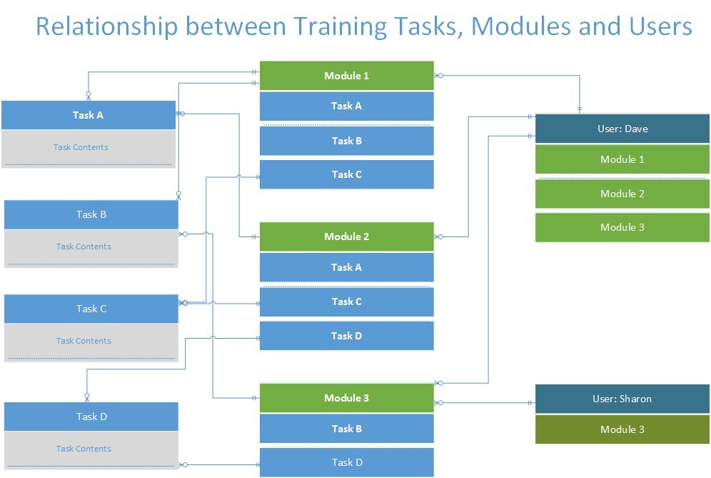 A group of Training Tasks gets associated together into a Training Module. |