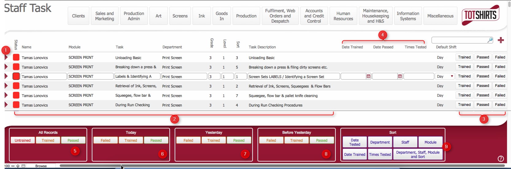 The Staff Task layout provides a view of Staff Members and the status of all the training tasks (via Training Modules) that have been allocated to them.