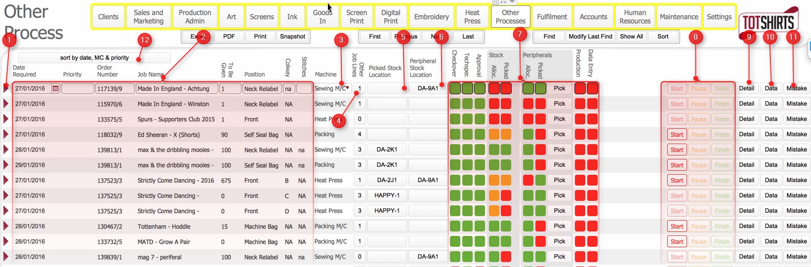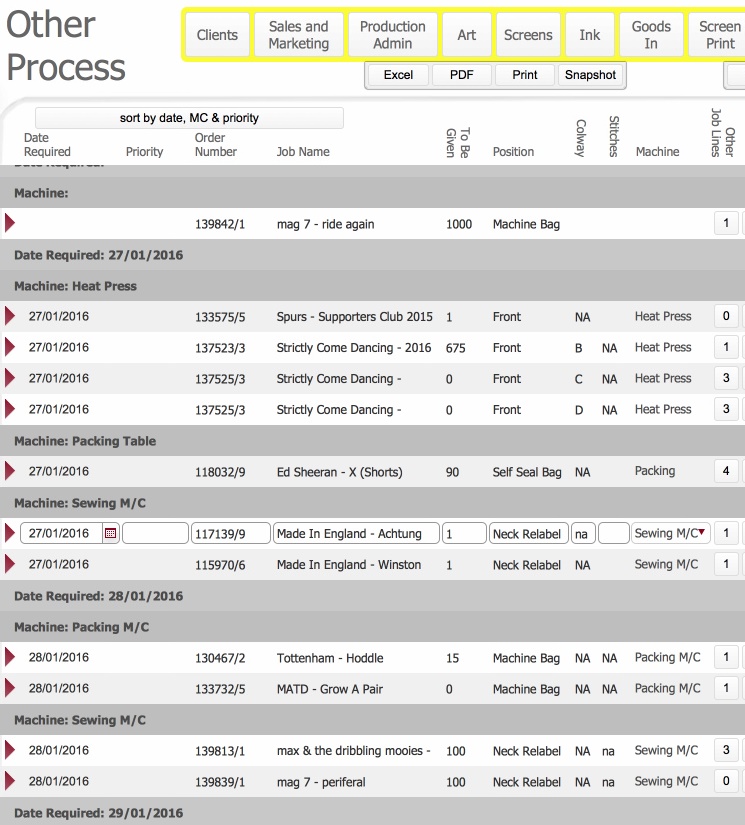 The Other Process layout outlines those jobs which other processes (labelling, bagging etc), and shows the status of the antecedent/connected processes.