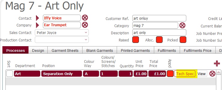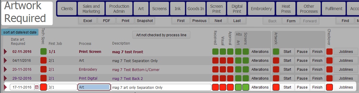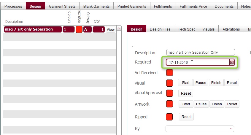Given this, we can understand that when the process line is added to a job, simultaneously an artwork required record is created which instructs the art department of the need to create the imagery that the process line will apply to the garment. In short it creates a "to do" record for the art department.