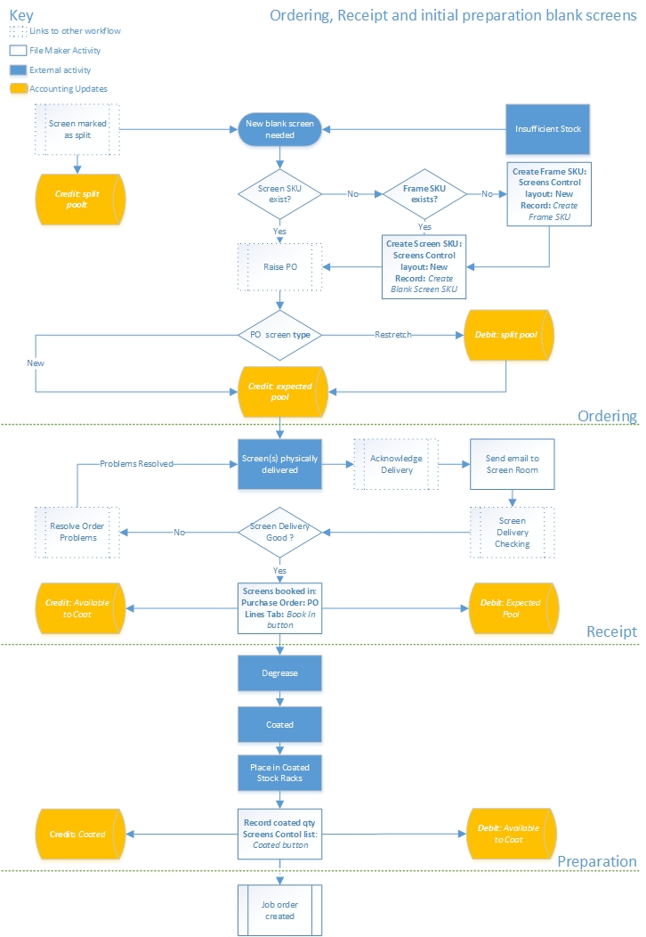 The following schematic shows the processes, both physical and performed within strokeone, as well as the accounting entries that occur when a new screen is ordered.