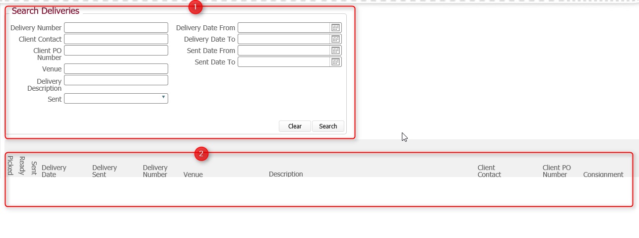 The search pane (1) allows you to define the criteria by which to search for your deliveries, whilst the results pane (2) displays the details of those deliveries that match your submitted search, and allow you to drill down to see further details.