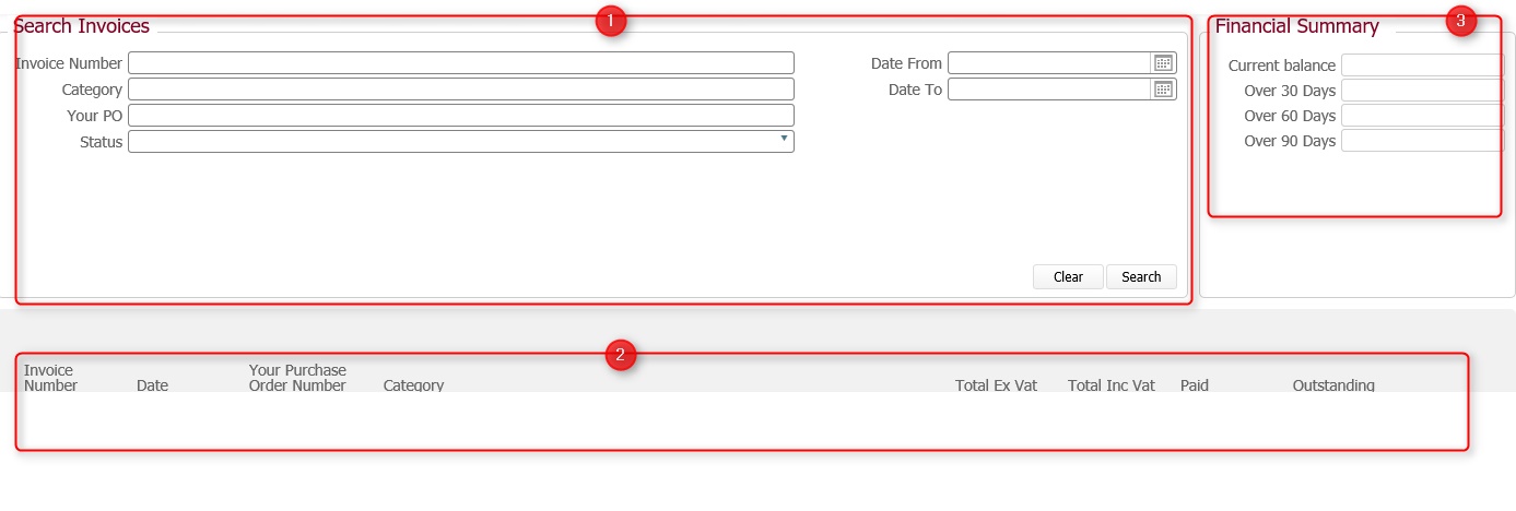 The search pane (1) allows you to define the criteria by which to search for invoices, whilst the results pane (2) displays the details of those invoices that match the submitted search.