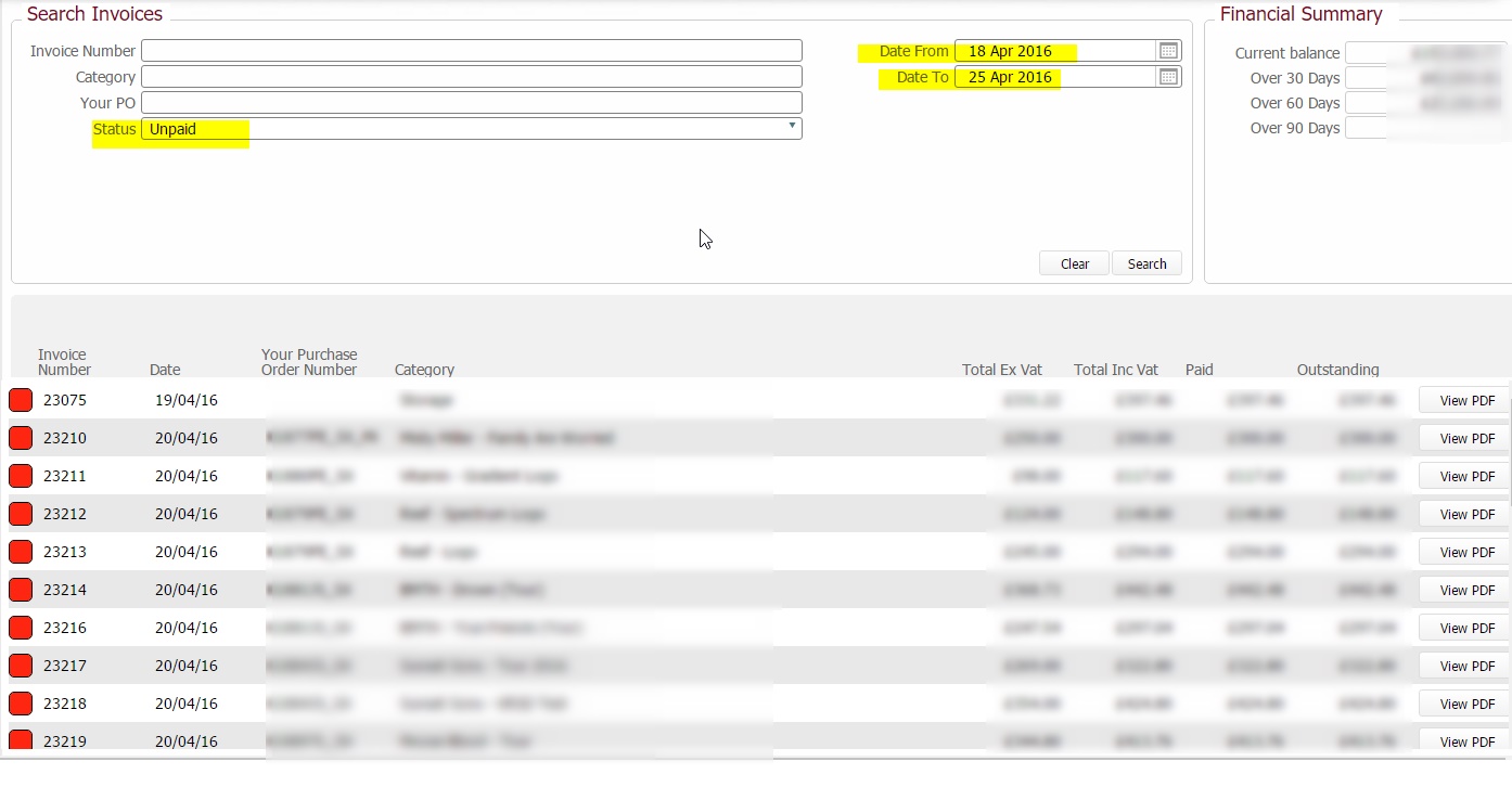 The Invoices Page allows you to search for any invoices that have been raised against you (see note 1), for services we have provided you, together with their current remittance status.
