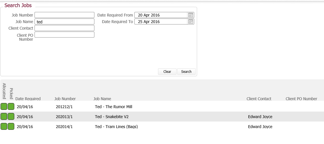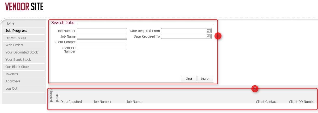 The search pane (1) allows you to define the criteria by which to search for jobs, whilst the results pane (2) displays the details of those jobs that match the submitted search
